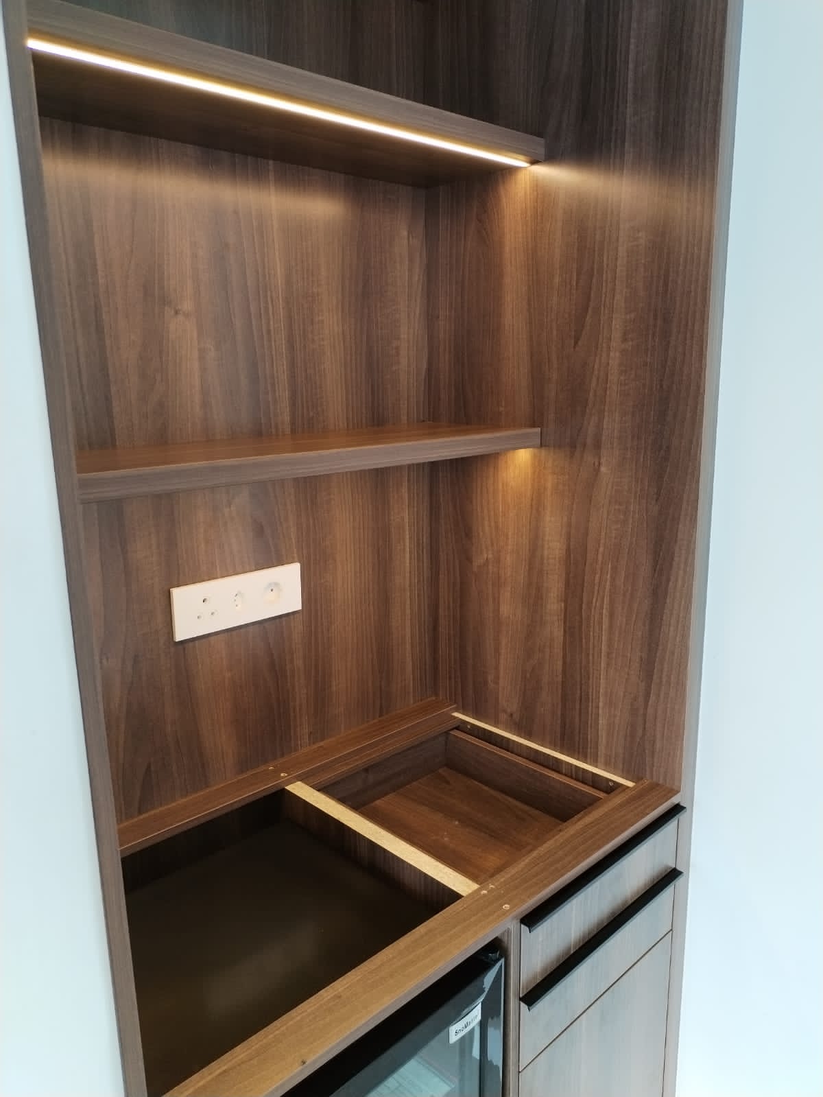 - Built using American walnut melamine with 1mm impact edging, the kitchenette includes: