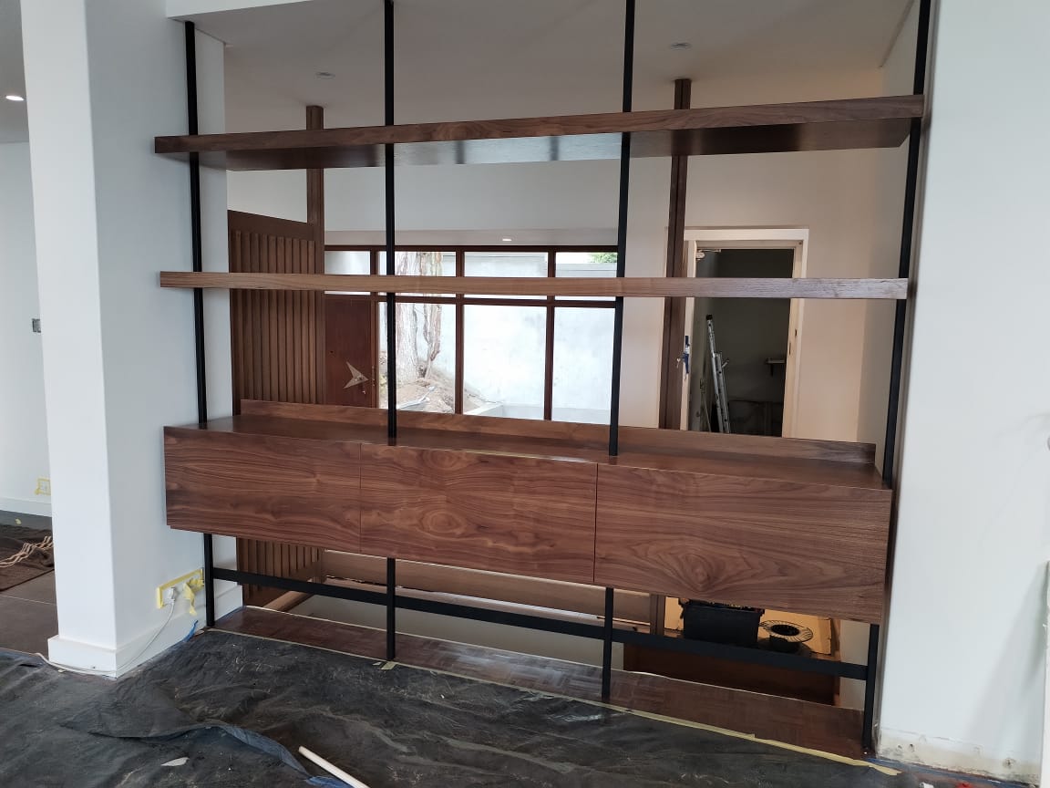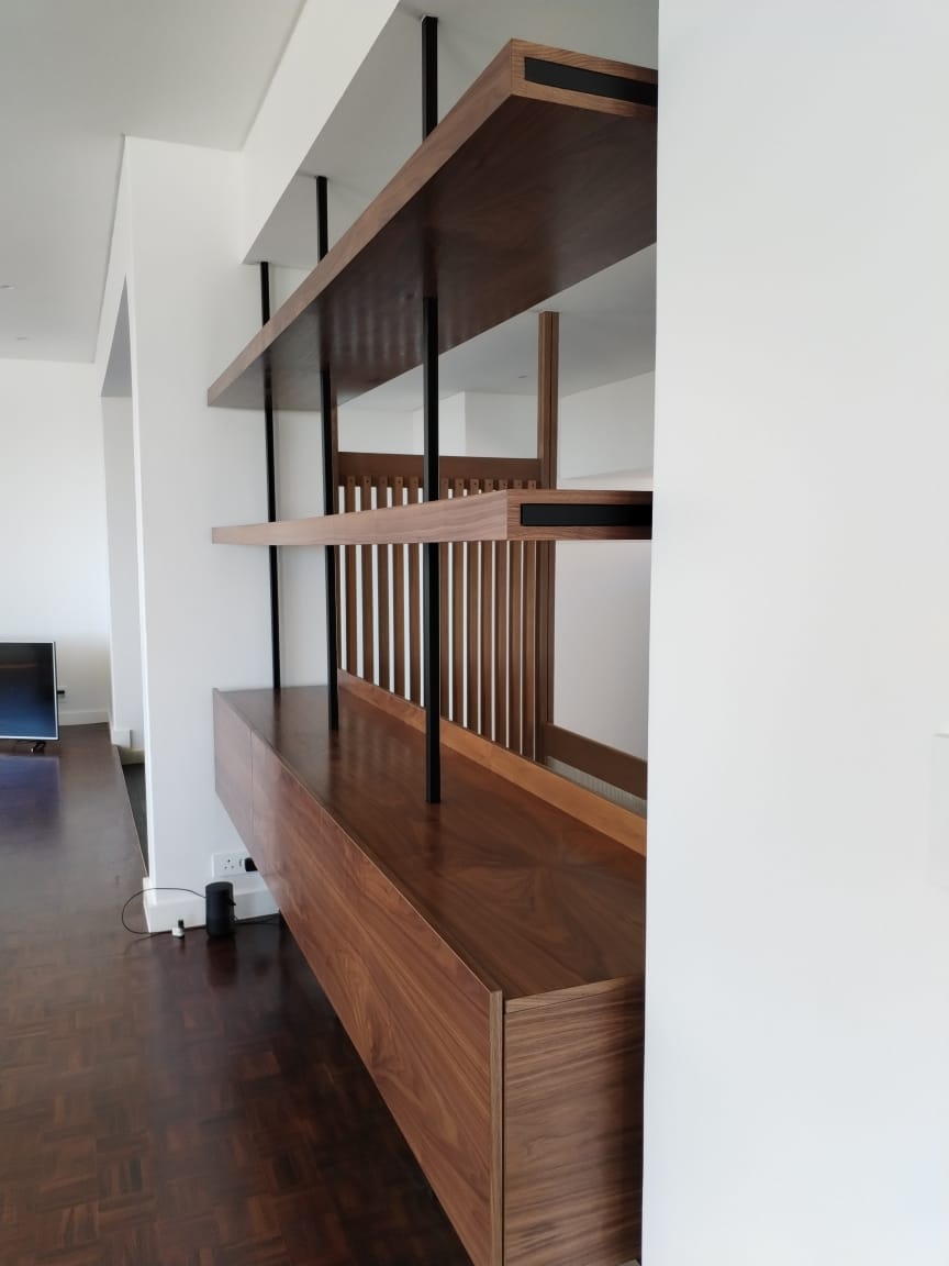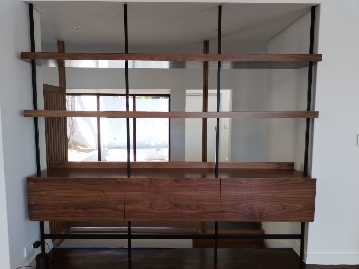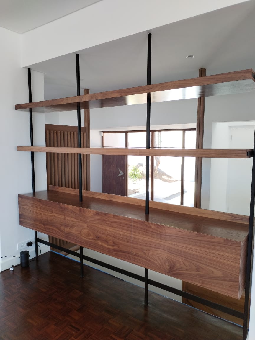 - Two 32mm thick floating shelves made from American walnut melamine.