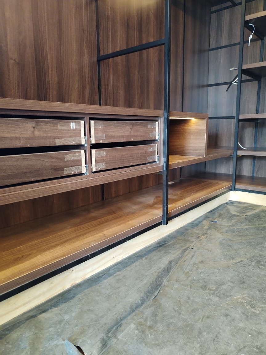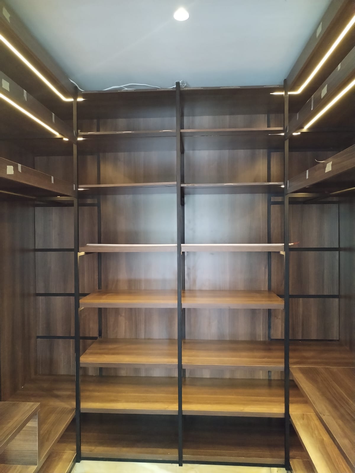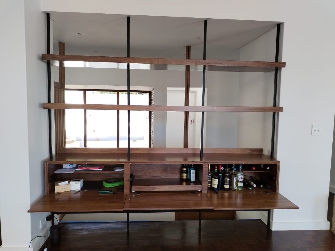 - Two 32mm thick floating shelves made from American walnut melamine.