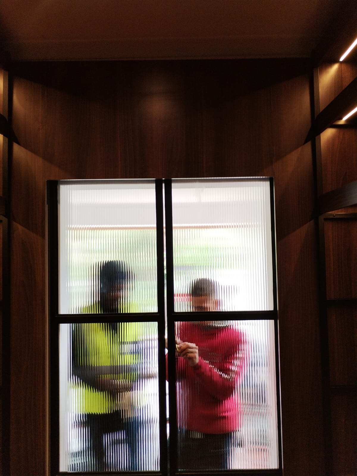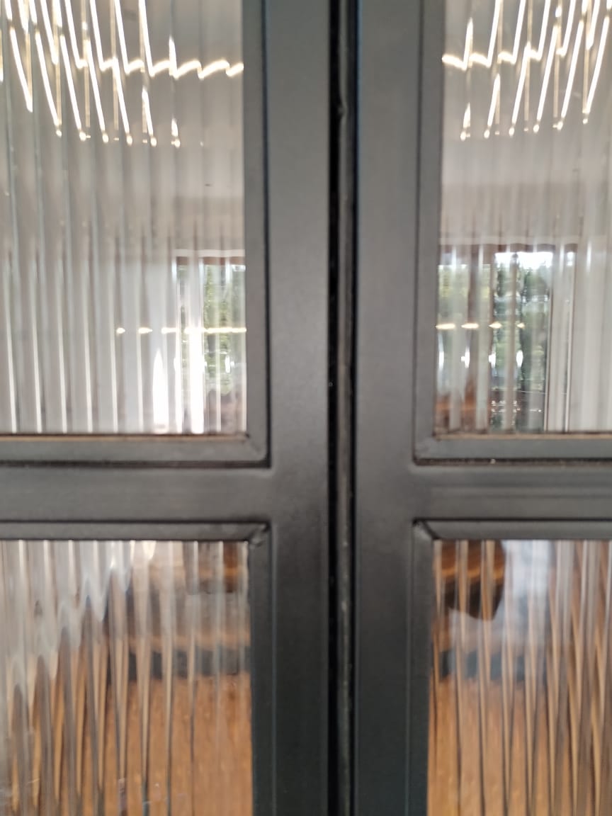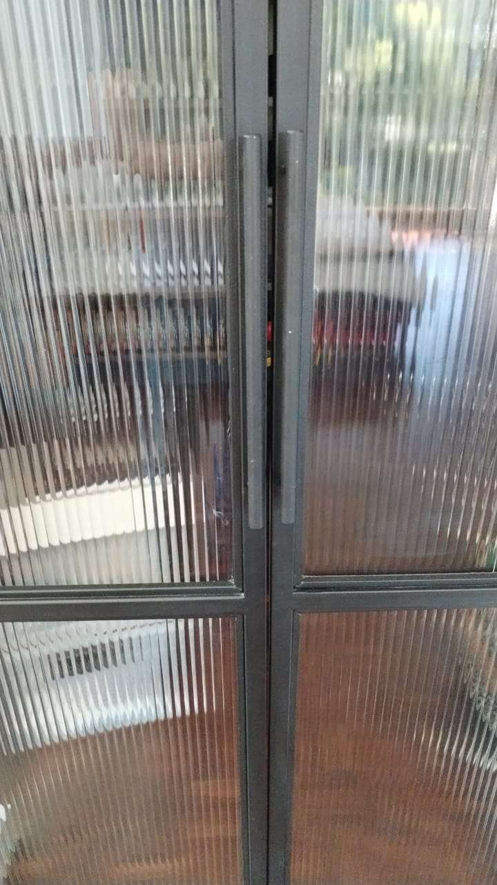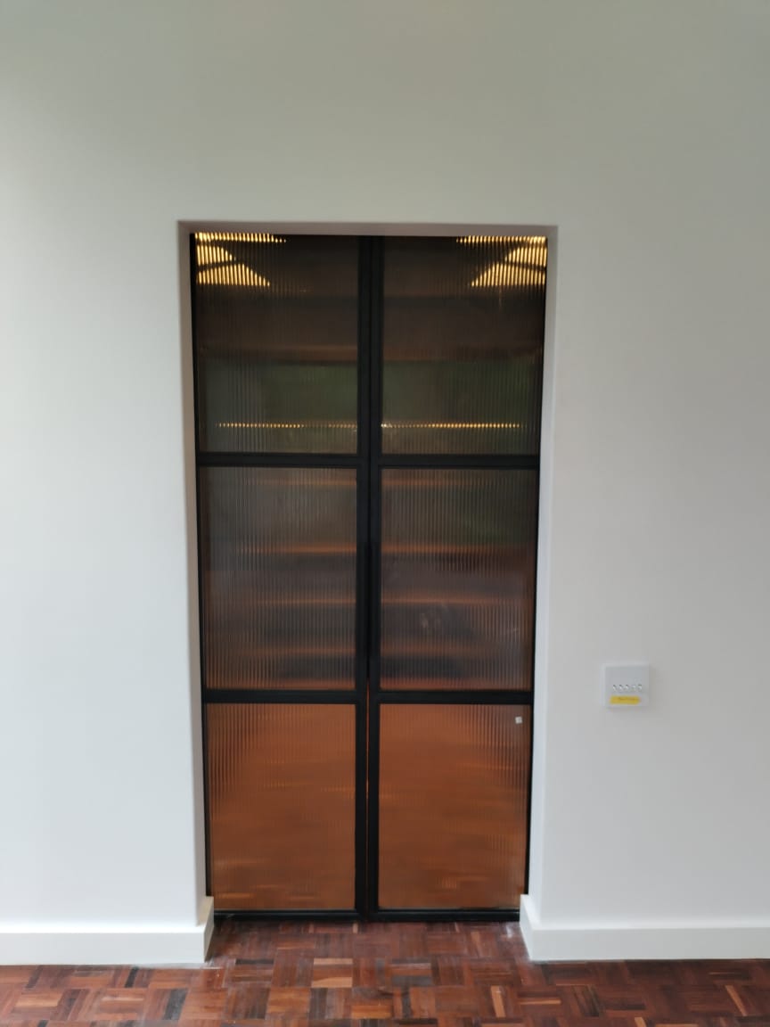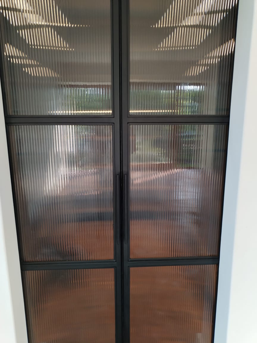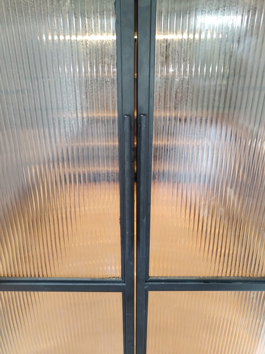 - The doors are constructed from 19x19mm square tubing, powder-coated in the same color as the drinks unit, with reeded glass panels fitted inside the frame.