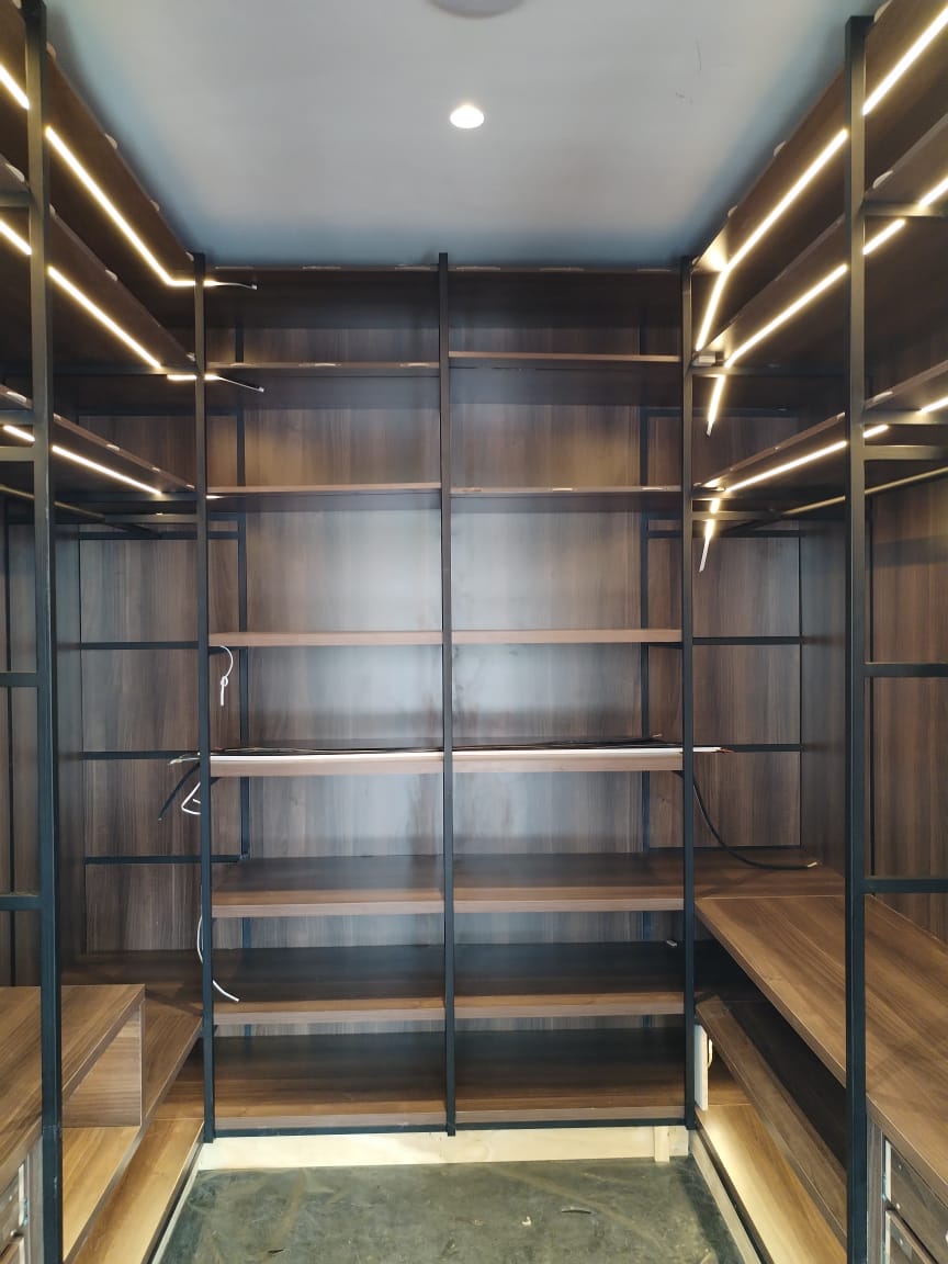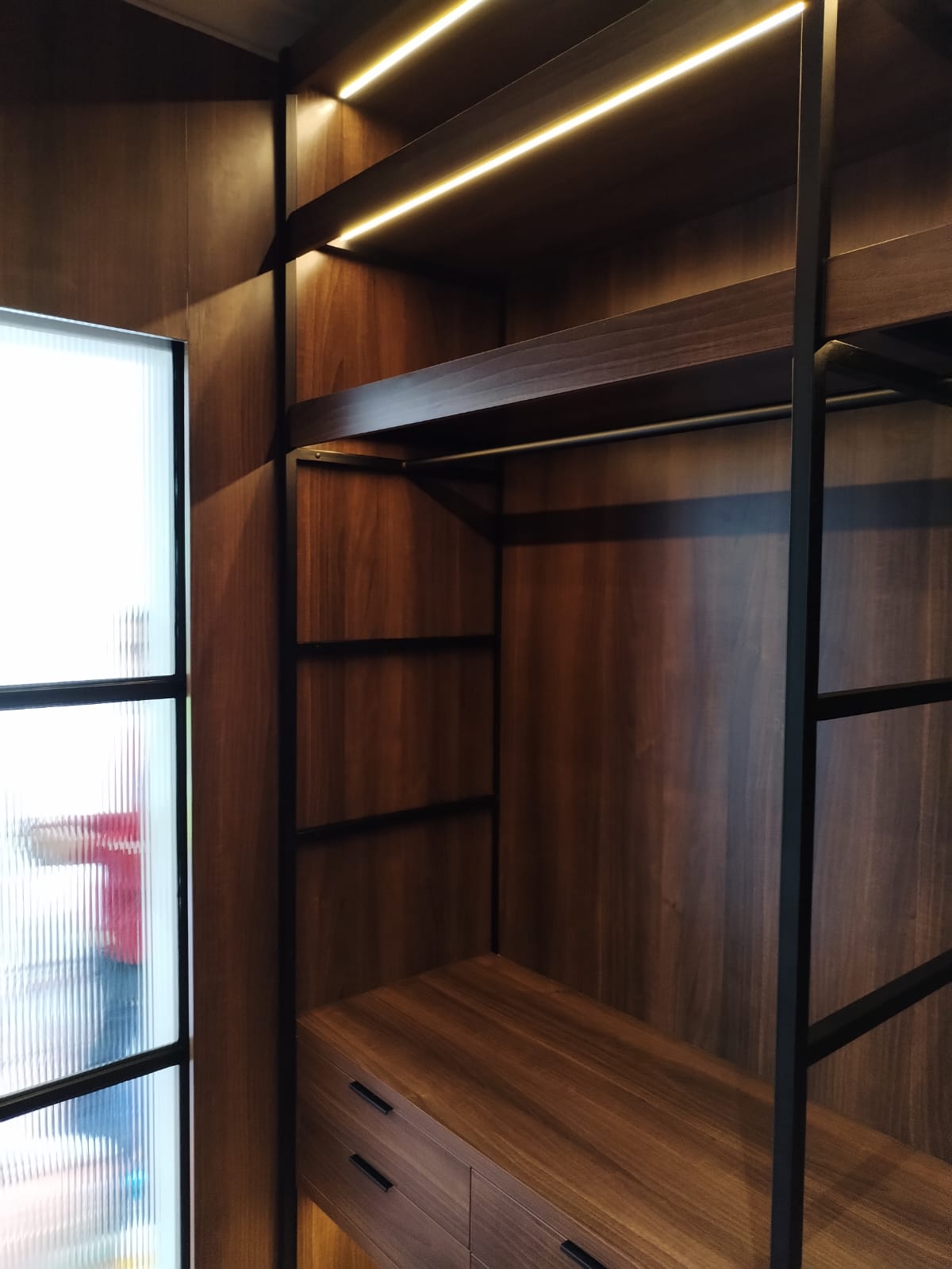 - The project includes 41 running meters of 3000 Kelvin LED strip lighting, installed within diffuser channels and powered by a transformer. The client is responsible for connections.