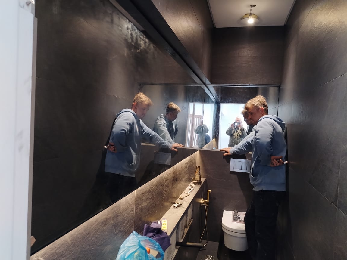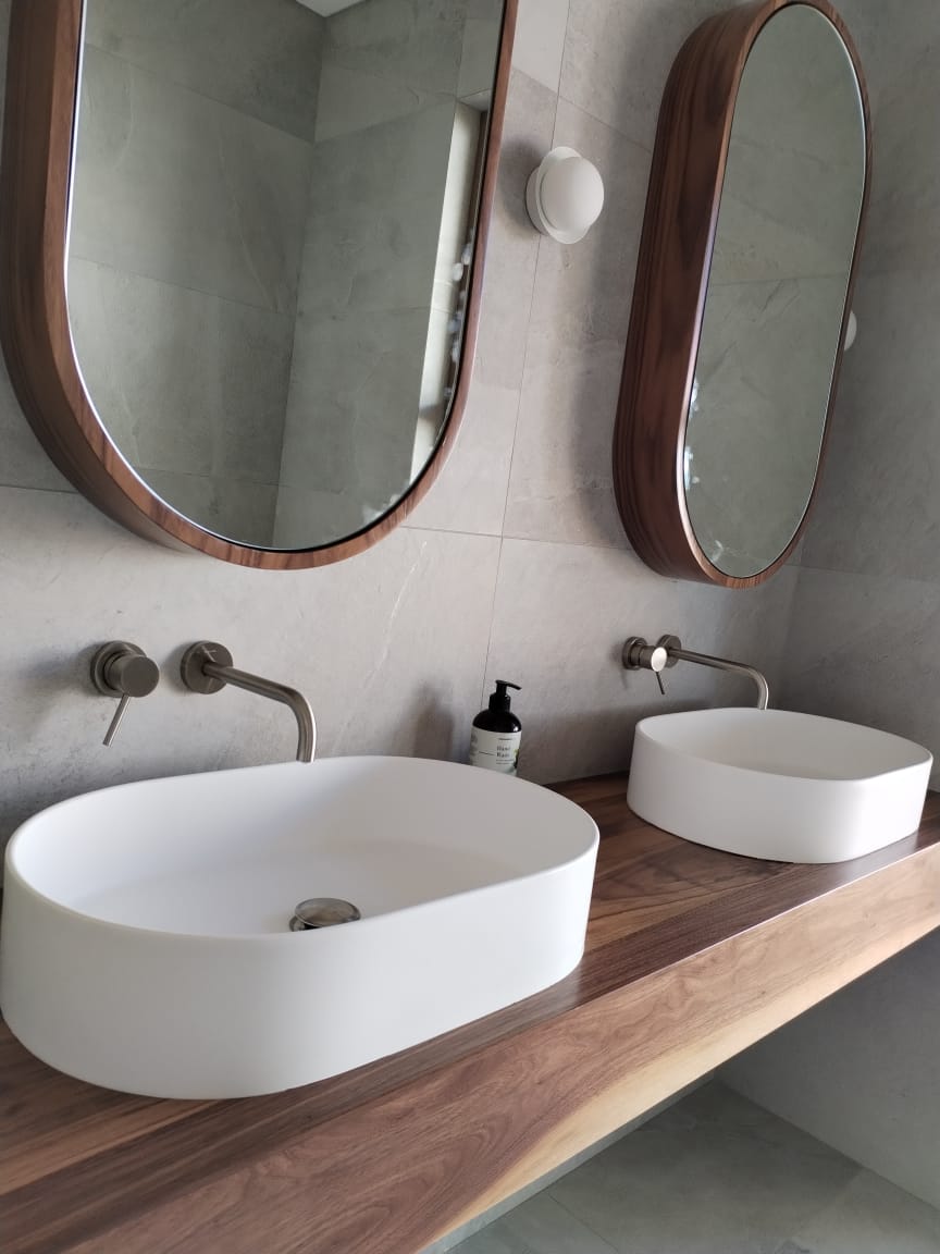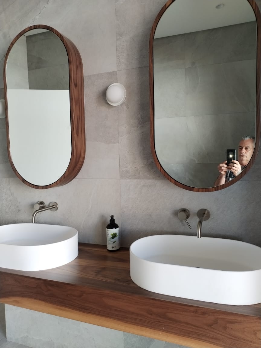 - The vanity is made of solid American walnut with a 25x25mm mild steel sub-frame, secured to the wall using rawl bolts.
