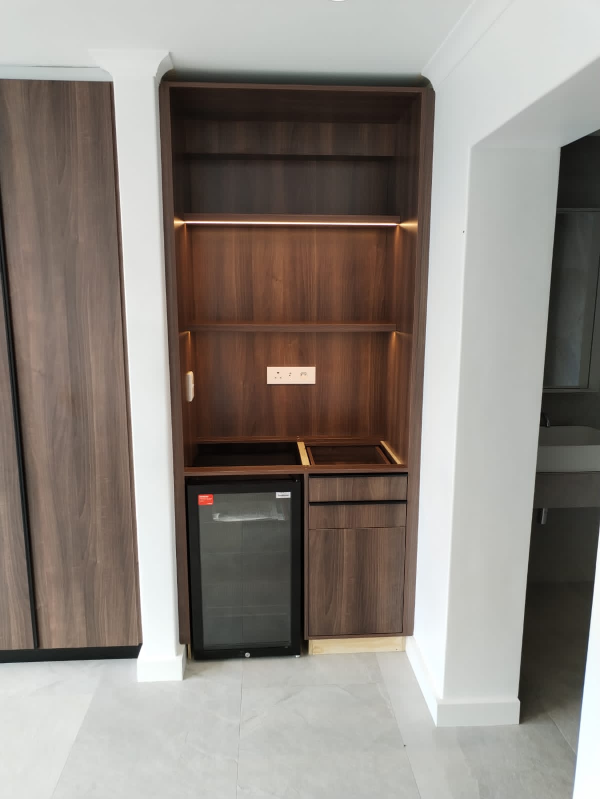 - A small fridge on the left.