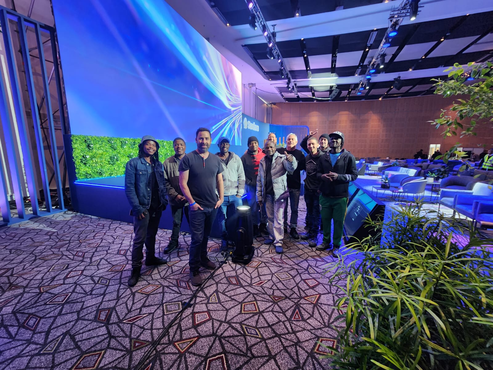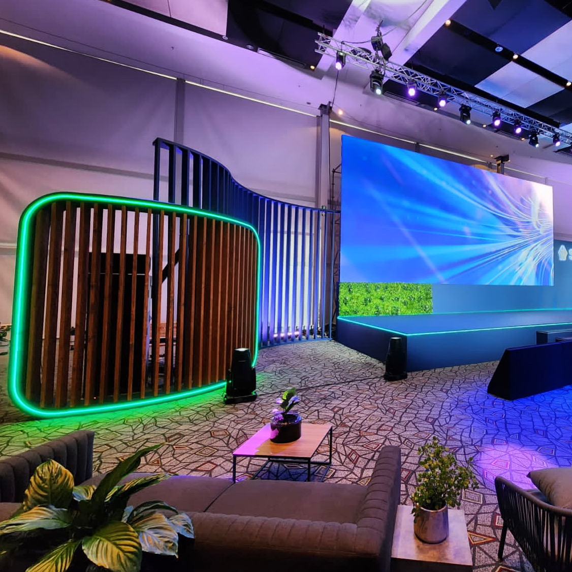 The Sanlam project involved a custom-designed stage and set build, using a variety of materials and construction techniques to achieve a cohesive and striking presentation.