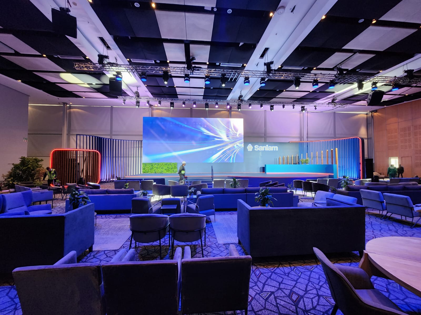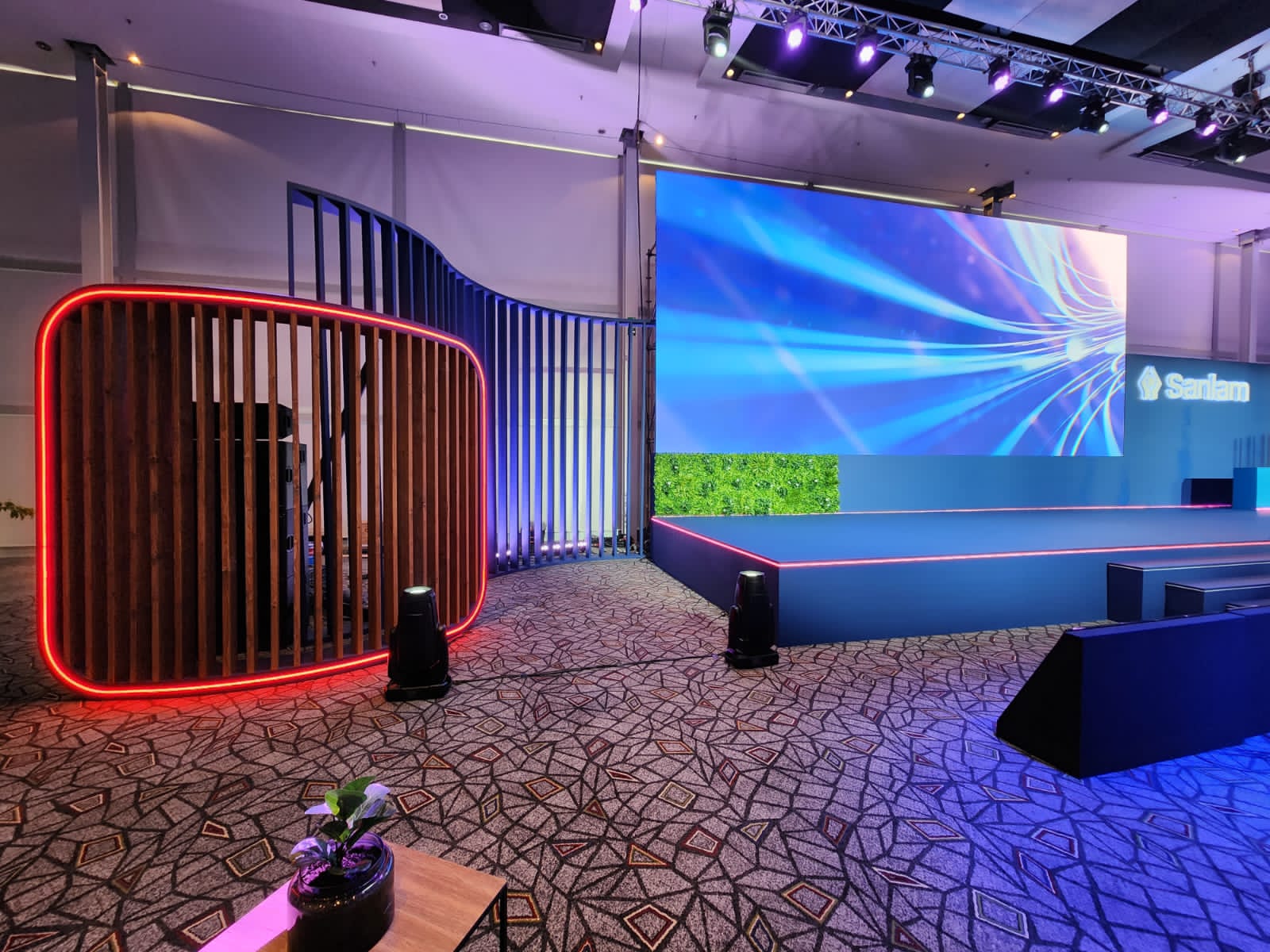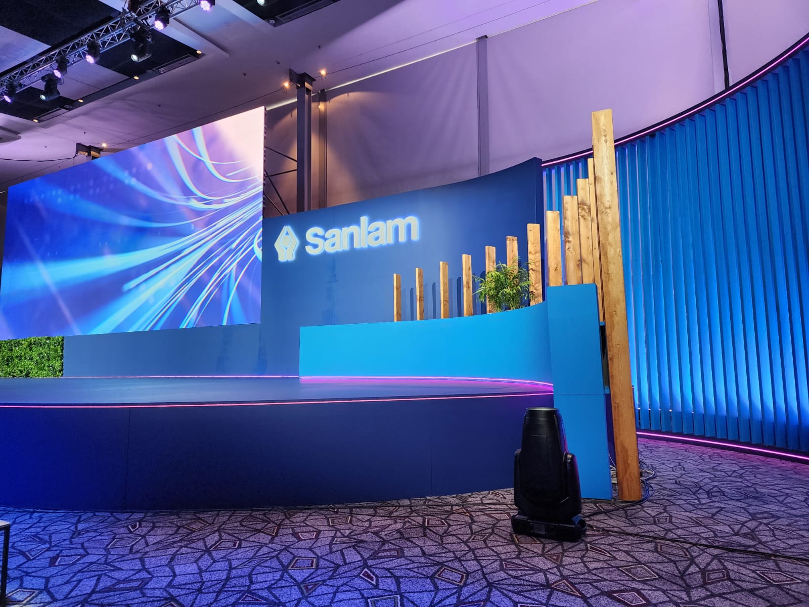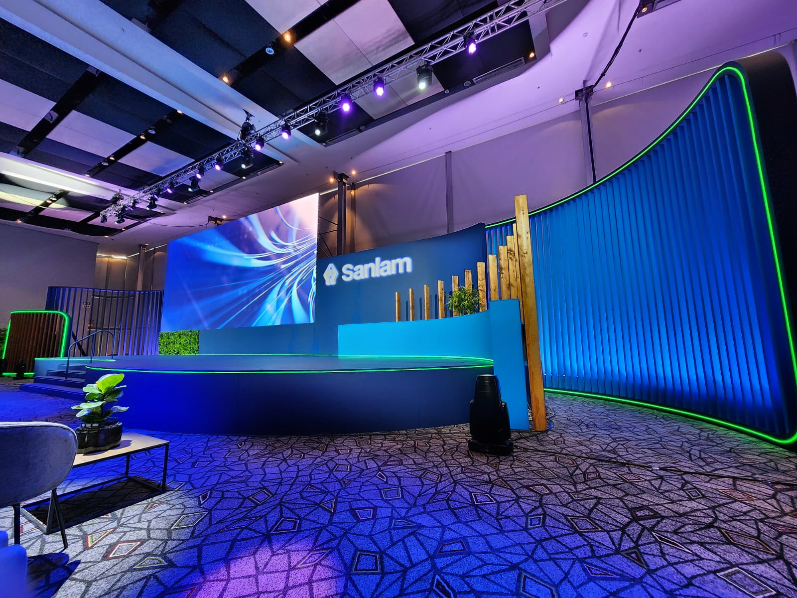 The project involved detailed customization of the stage and feature walls, integrating LED lighting, and CNC-cut elements to highlight Sanlam’s brand presence at the event.