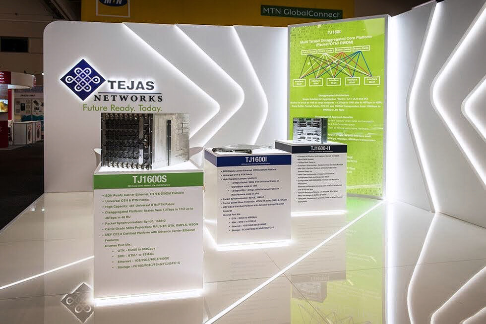 This project demonstrates Tejas Network’s dedication to combining advanced technology with sleek design, creating an exhibition space that draws attention through illuminated features and modern materials.