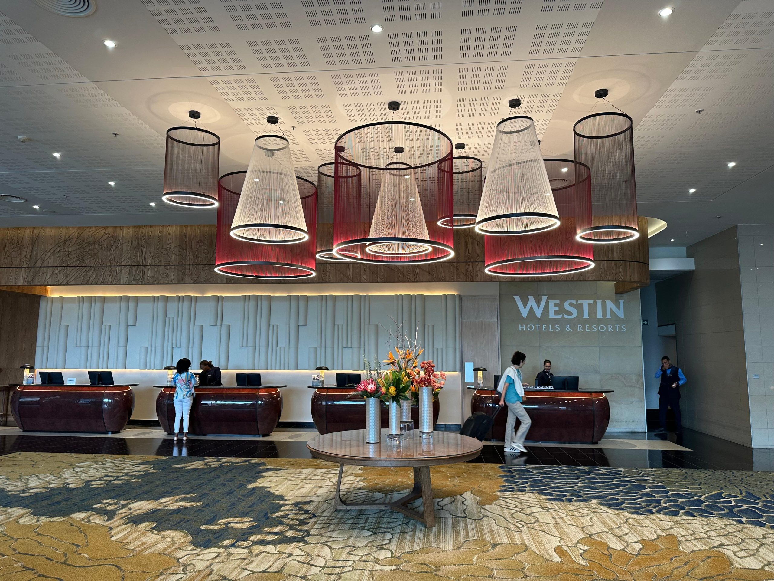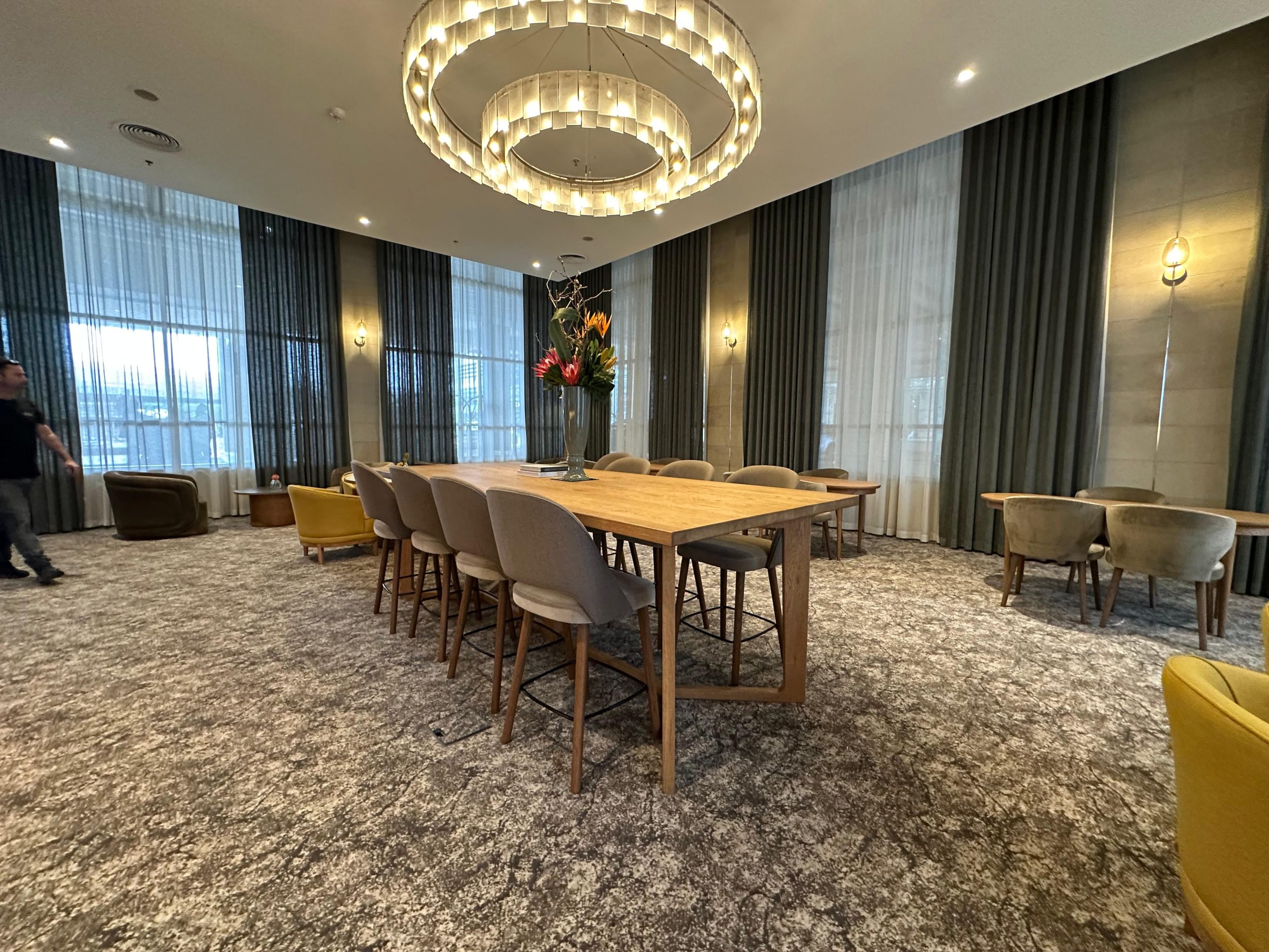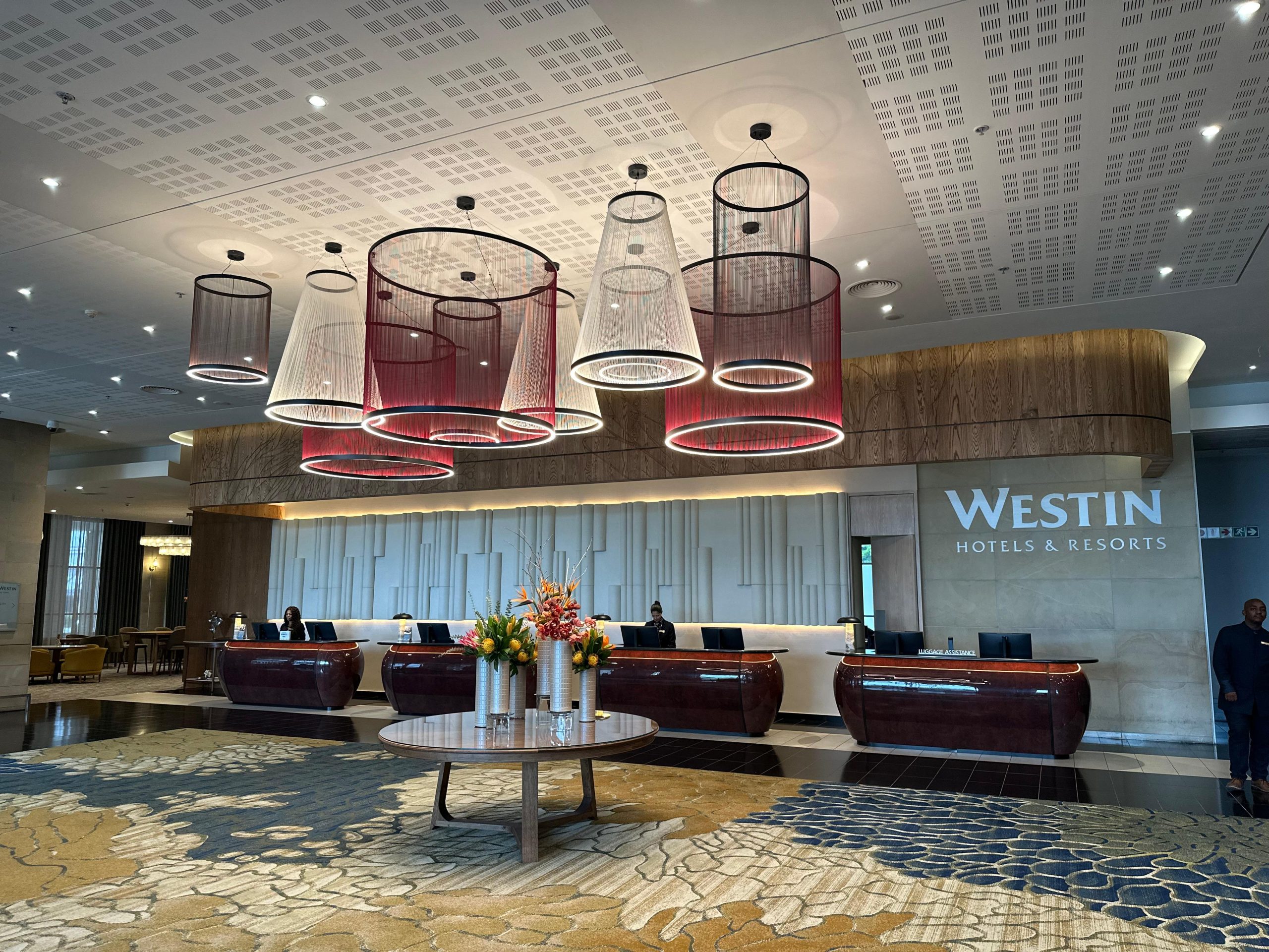 Custom-designed concierge desks constructed out of Polycarbonate moulds with UV print, Niemann board functional cabinets and Zimbabwean stone top. Feature Nappa leather decorative trim.